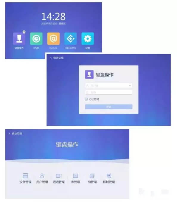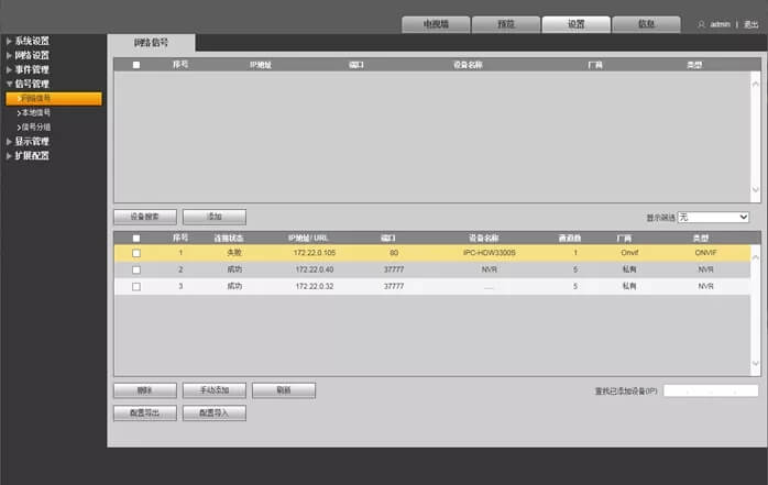 1.键盘操作页面登录—2.添加设备—3.查看输入/输出通道号(通道管理)—4.解码上墙(区域管理)