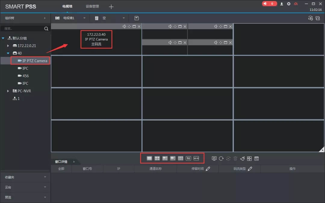 鼠标移动到对应通道,左键点击选择主码流或者辅码流,直接移动到指定窗口即可上墙