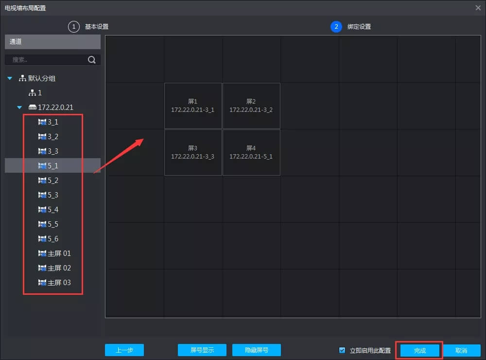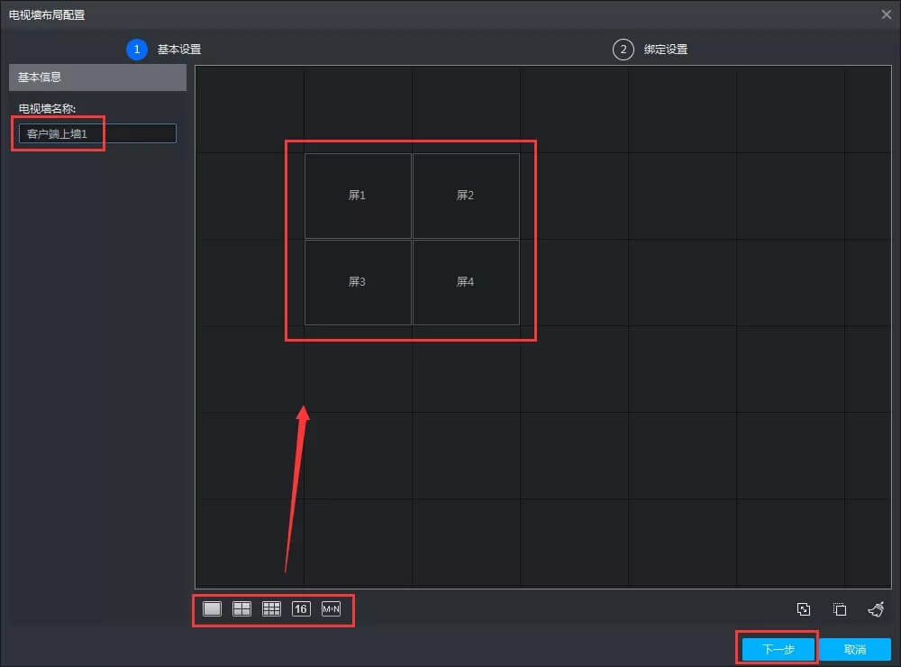 电视墙名称自定义,选择屏数后往空白处拖动固定,下一步
