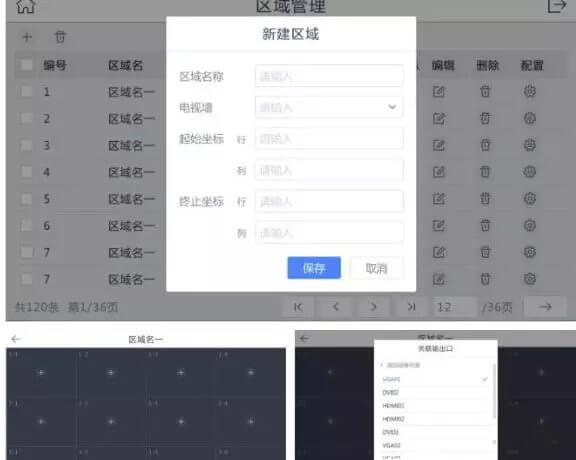 4、区域管理,添加区域名称,选择电视墙,起始坐标几行几列,点击保存。进入对应区域名称的页面,关联输出口选择要关联的输入设备编号名称,保存。即可完成解码上墙操作。