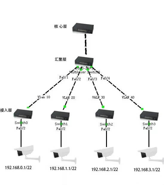 这里面每个VLAN都可以容纳250个点位以上,四个网段共有1000 ip地址可以使用,是完合足够分配每个区域的ip地址的,另外,后续每个区域若有增加点位,都是有足够的预留,值得注意的是,这里面接入层交换机是需要合理的分配,接入层交换机的选择,我们之前有提到过,这里不做过多说明。