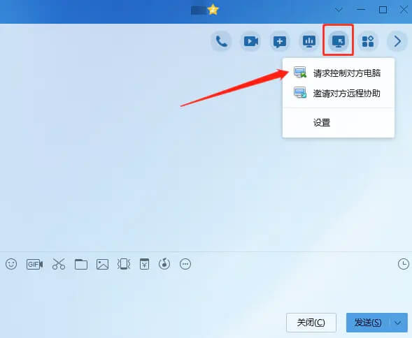使用鼠标点击“…”图标选项后,隐藏着的选项按钮就会展现出来。我们点击选择一个电脑屏幕有箭头指向的选项按钮图标,进行发起远程电脑控制。